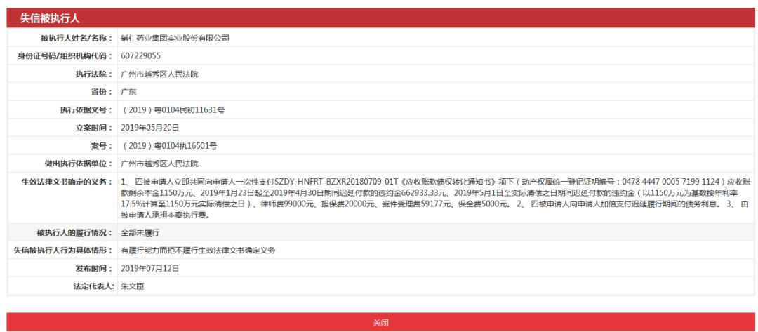 天眼查还显示,因为有履行能力而拒不履行生效法律文书确定义务,5月17日,辅仁药业集团实业股份有限公司(辅仁药业曾用名)被上海市浦东新区人民法院列为失信被执行人。7月12日,再次被广州市越秀区人民法院列为关联失信被执行人。