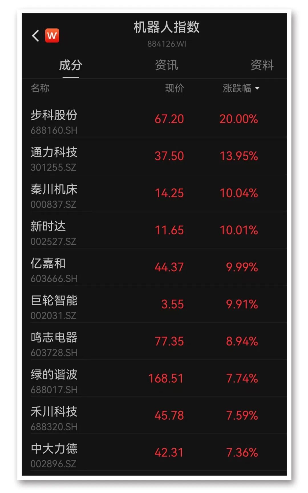 机器人板块掀起涨停潮,步科股份“20CM”涨停,新时达收获4天3板。亿嘉和、恒为科技、巨轮智能、秦川机床集体涨停。