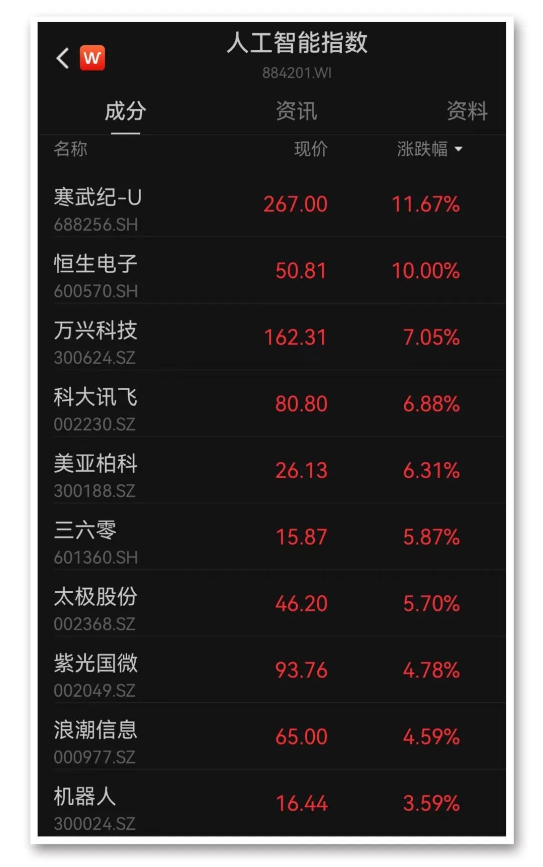 万兴科技涨超7%,收报162.31元/股,创历史新高;科大讯飞上涨近7%,收报80.80元/股,亦创历史新高;寒武纪-U、浪潮信息、三六零、恒生电子等均大涨。