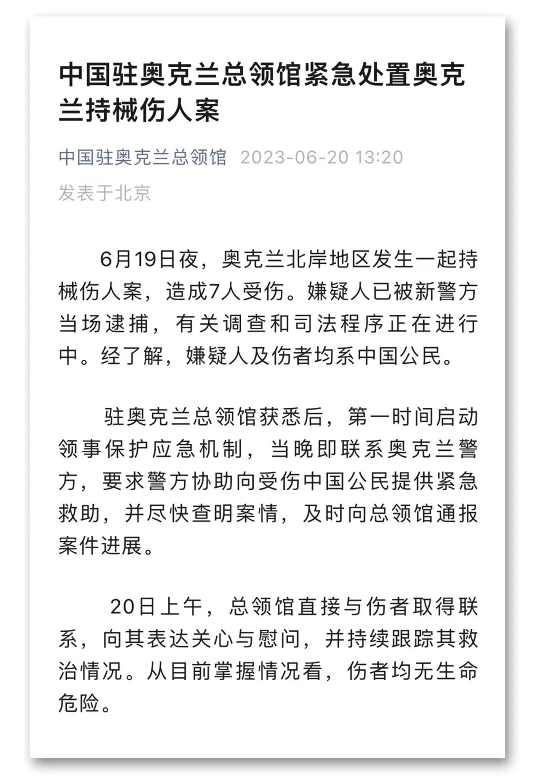据中国驻奥克兰总领馆消息,6月19日夜,奥克兰北岸地区发生一起持械伤人案,造成7人受伤。嫌疑人已被新警方当场逮捕,有关调查和司法程序正在进行中。经了解,嫌疑人及伤者均系中国公民。