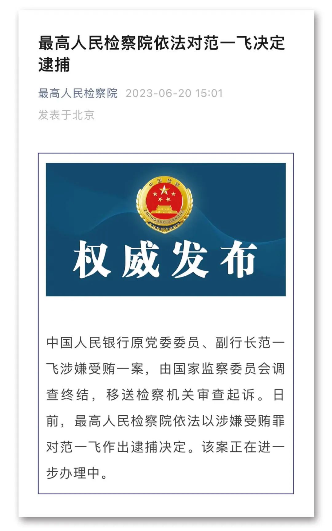 据最高人民检察院消息,中国人民银行原党委委员、副行长范一飞涉嫌受贿一案,由国家监察委员会调查终结,移送检察机关审查起诉。日前,最高人民检察院依法以涉嫌受贿罪对范一飞作出逮捕决定。该案正在进一步办理中。