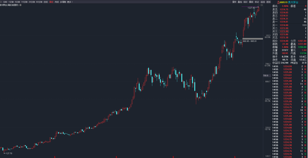 贵州茅台,2001年8月27日登陆上交所,前四年间股价表现一直不温不火,2006年起股价开始上涨,2013年由于塑化剂风波、限制“三公”消费政策等因素影响,出现回调。之后便开启了加速上涨模式,尤其是进入2017年以后,400元、500元……1000元,拿下了一个个整数关口。