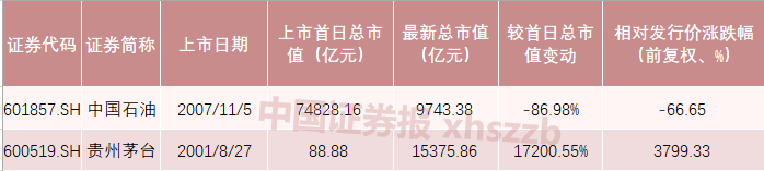 2007年11月5日,IPO融资额668亿元,头顶“亚洲最赚钱的公司”、“巴菲特概念股”称号的中国石油登陆上交所,盘中创出48.62元的历史新高,当日收盘后成为全球股票市值最大的上市公司。上市首日之后,该股便开启了寻底之路,期间仅在2009年4月-7月、2014年11月-2015年5月有过两次像样的反弹。截至今年11月13日,中国石油总市值为9743.38亿元,较上市首日总市值缩水近九成。