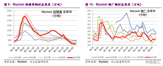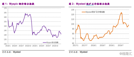 值得注意的是,回顾上一月,基于年底基建赶工期,随着市场需求的回升,再加上国产铁精矿、炼焦煤和冶金焦价格持续下降,11月钢材价格有所上涨,数据显示,11月末,中国钢材价格指数(CSPI)为108.17点,环比上升3.67%,同比上升1.78点,升幅为1.67%;且截止到11月末,螺纹钢期货主力合约的收盘价、最高价和最低价分别较月初上升7.10%、7.22%和7.30%。而随着钢价显出一定的强势,其库存也得到一定的消化,数据显示,2019年11月,全国20个城市5大类品种钢材社会库存合计连续三个月呈下降之势,可以看出由于上一月钢铁需求显出阶段性的韧性,行业景气度有所缓和。但就整体而言,进入12月之后,随着市场需求的萎缩,产能消化的空间有限,供需关系的不平衡性或将更为凸显,且钢价也将在震荡中继续下行。