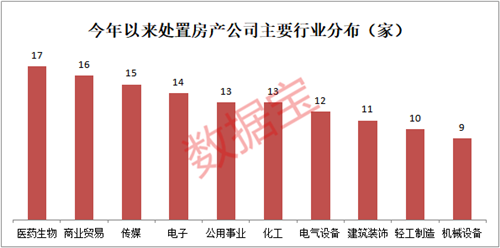 从行业来看,除房地产行业之外,9个行业公司数量超10家。医药生物、商业贸易、传媒行业居多,均在15家以上,建筑装饰行业有11家,纺织服装、农林牧渔、有色金属等传统行业都超过5家。