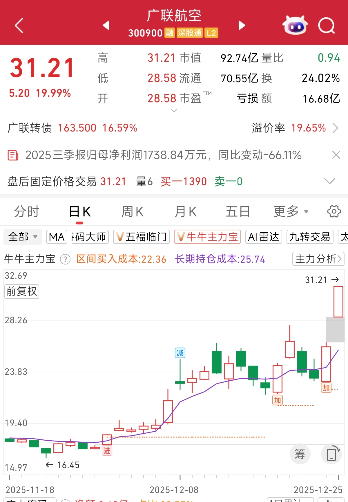 根据“主力宝”监控,今日大涨的广联航空,主力在11月28日进场,中间进行一次减仓和两次加仓,迄今已经上涨80%。