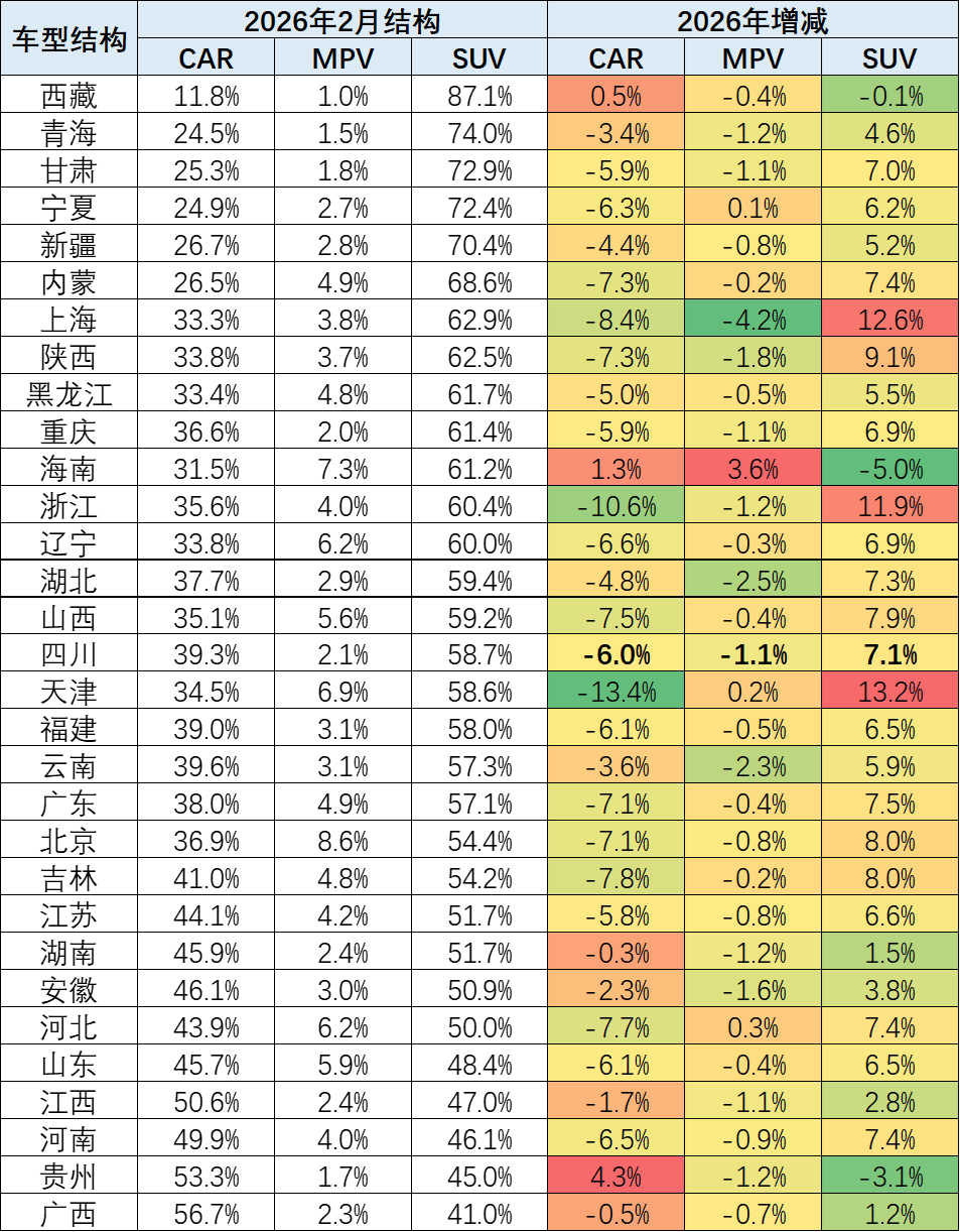 国内乘用车消费的车身结构呈现显著分化态势,SUV品类保持较好的增长势头,且区域表现差异明显。SUV市场的增长主要集中在中西部地区,东部地区表现相对偏弱,其中西北、西南地区SUV需求尤为旺盛。这一特征与区域地形地貌高度相关,中西部地区以山区、丘陵地形为主,对车辆通过性要求更高,叠加新能源SUV动力性能优势突出,共同推动了当地SUV市场的强势表现。