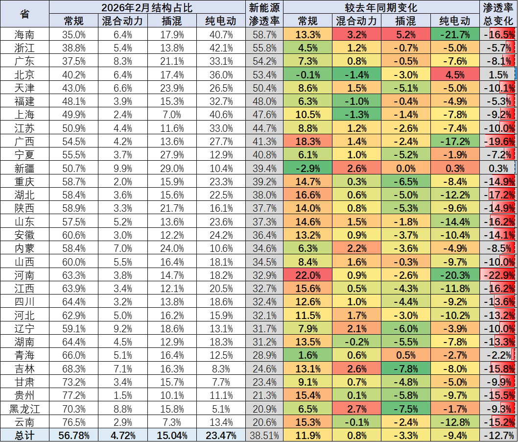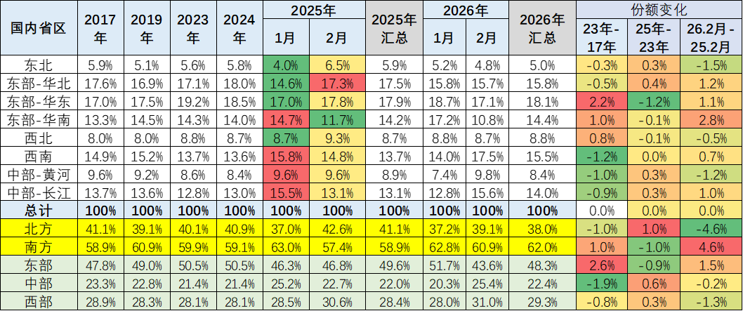 乘联分会秘书长崔东树发布《2026年2月乘用车区域市场流向分析》,其中提到,国内车市结构性下滑与区域消费政策启动差异化,正深刻重塑国内乘用车区域市场的发展格局。在国家 “两新” 政策拉动乘用车内需消费的政策环境下,2026年全国乘用车零售市场呈现出低端消费萎缩、被动消费升级下的分化增长特殊走势。2026年2月,北方车市市场份额较上年同期下降4.6个百分点;南方及东部沿海车市单月表现相对强势,从全年维度来看,南方地区地方财政补贴力度更大、落地效率更高,成为当地车市增长的核心拉动因素。