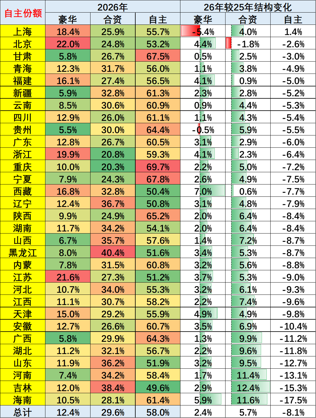 从品牌格局的区域分布来看,上海、北京等一线城市豪华车市场占比稳居高位,而全国绝大部分省市市场中,自主品牌份额已占据半壁江山。