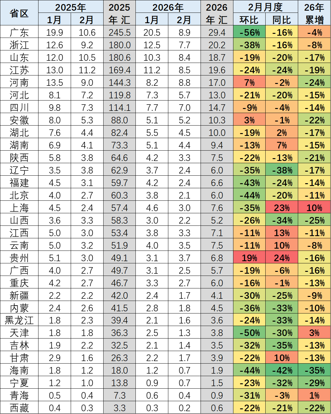 但这一格局在2026年年初出现阶段性变化:2026年2月,北方车市市场份额较上年同期下降4.6个百分点;南方及东部沿海车市单月表现相对强势,从全年维度来看,南方地区地方财政补贴力度更大、落地效率更高,成为当地车市增长的核心拉动因素。
