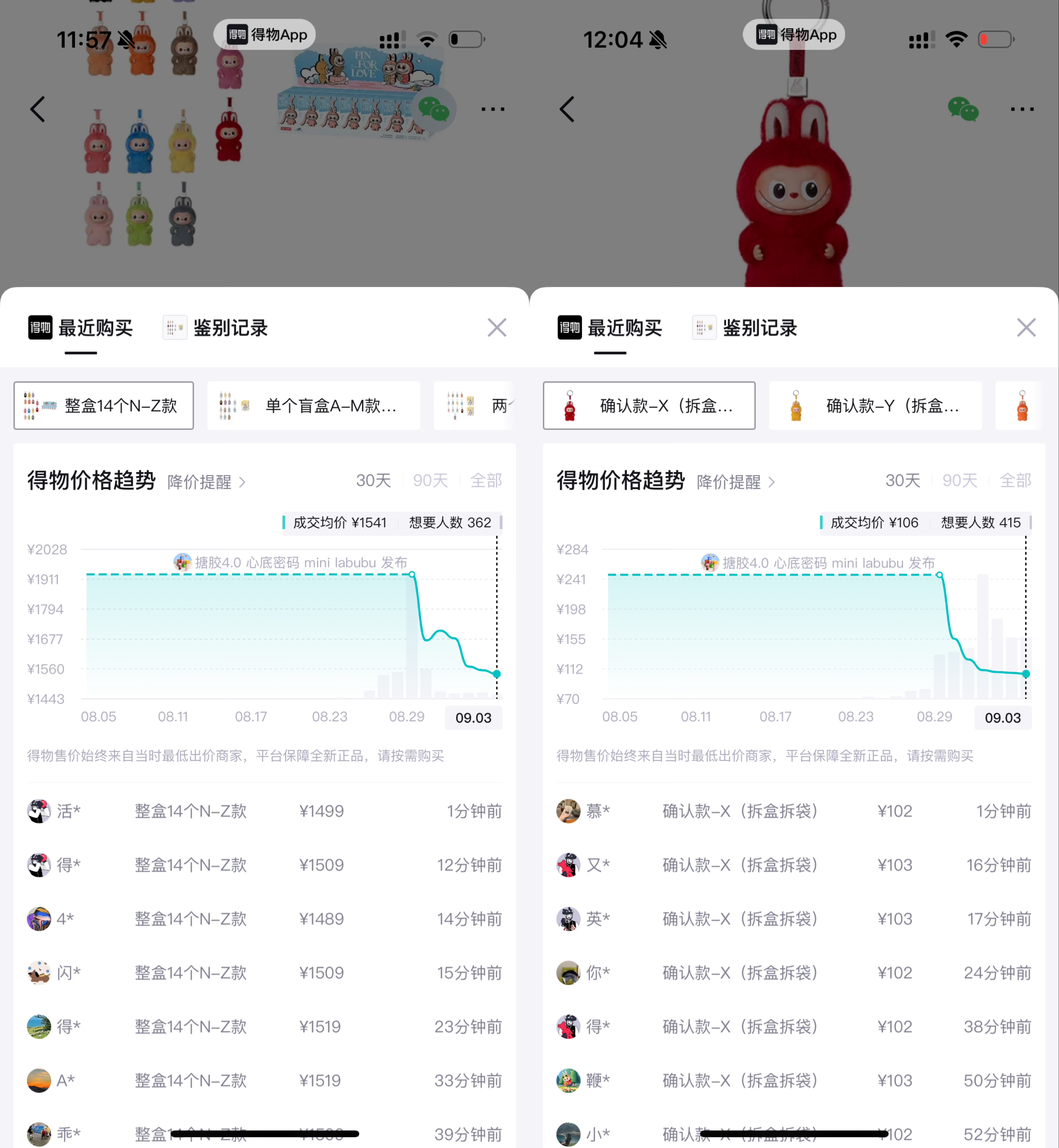以14件为一组、原价1106元的(N~Z)端盒为例,发售当天得物app成交均价一度飙升至1930元,昨日已回落至1541元,下跌20%,“想要人数”也从9398人降至362人。非热门款中,X的昨日成交均价为106元,较发售日下降57%。闲鱼平台数据也显示,Labubu4.0成交均价已从8月27日的143元下降至106元。