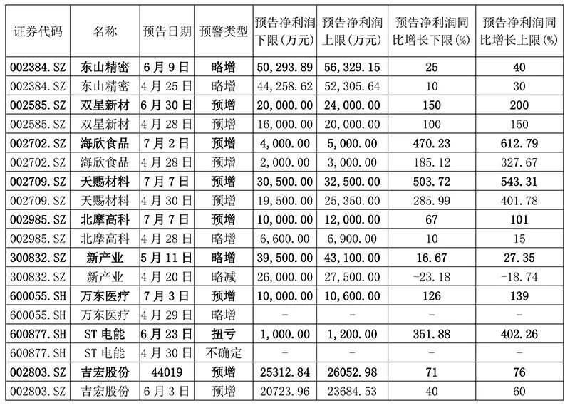 截至7月7日,今年上半年业绩预告修正超预期的上市公司共有9家。上证报记者注意到,海欣食品、天赐材料在预告上半年业绩大幅增长的情况下,修正后的业绩预告进一步大幅上调了预计业绩。