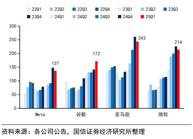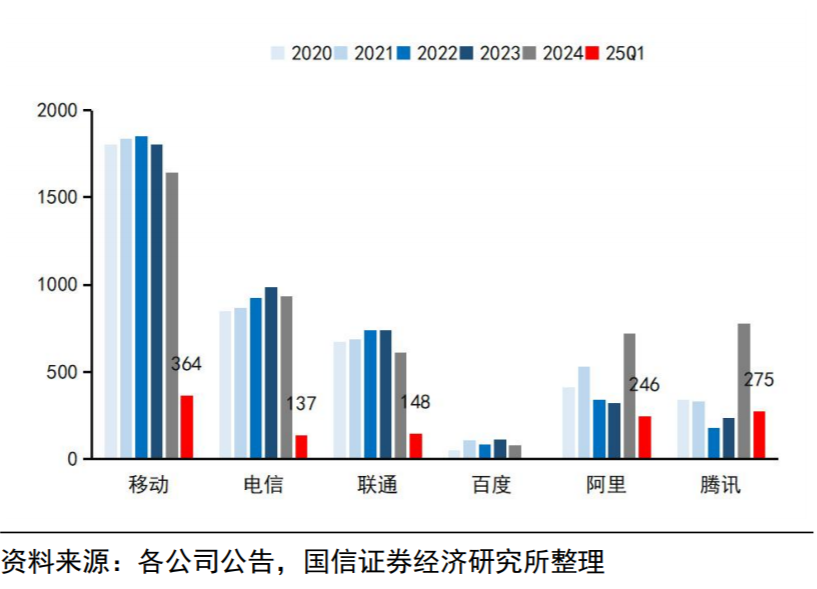 资本开支大部分用于算力(数据中心)建设。海外四大云厂2025 年资本开支将持续增长,且投资将主要用于服务器、数据中心和网络基础设施,有望促进 AI 基础设施产业链景气度持续向上。2025 年 5 月,Meta 将全年资本开支计划从 600-650 亿美元上调至 640-720 亿美元,主要是增加对数据中心及AI 硬件设备的投资。国内方面,包括三大移动运营商和阿里、腾讯、字节在内的头部互联网企业同样大力加强算力基础设施投入。