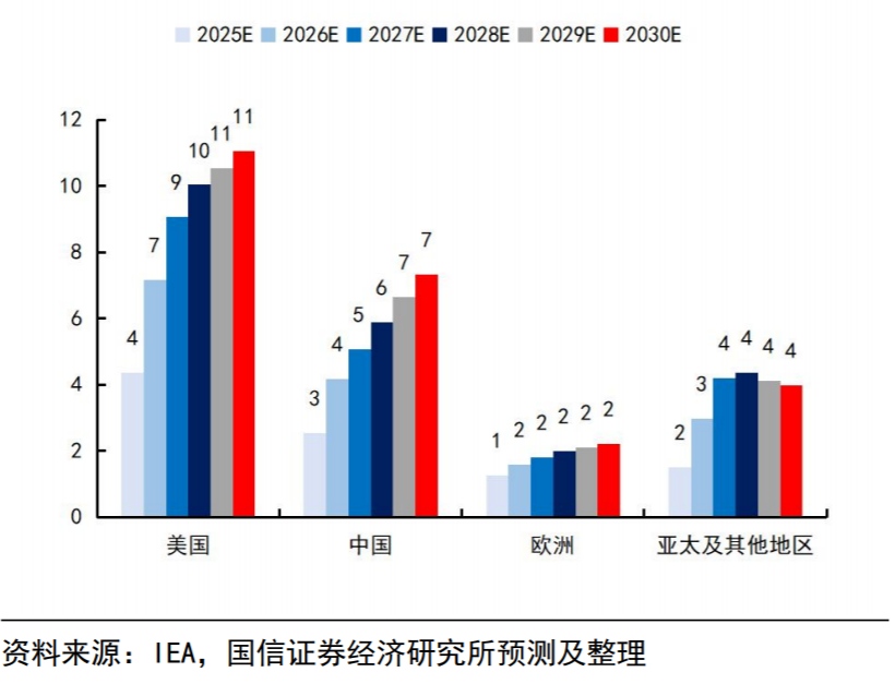 算力是数字经济时代的核心生产力,是继热力、电力之后重要的新生产力。根据 IEA 数据,2024年全球数据中心累计算力负载(即 IT 设备负载,包括服务器、网络及存储等)约68GW,预计到 2030 年将达到 174GW,2025-2030 年新增算力负载106GW,年均新增17.7GW。参考IEA预测,预计2025-2030年全球新增AI算力负载为9.7/15.9/20.2/22.3/23.4/24.6GW。