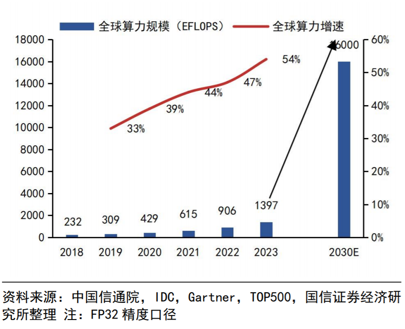 全球算力市场规模及预测(单位:EFLOPS,左);2025-2030 年全球 AIDC 年度新增算力预测(单位:GW,右) |