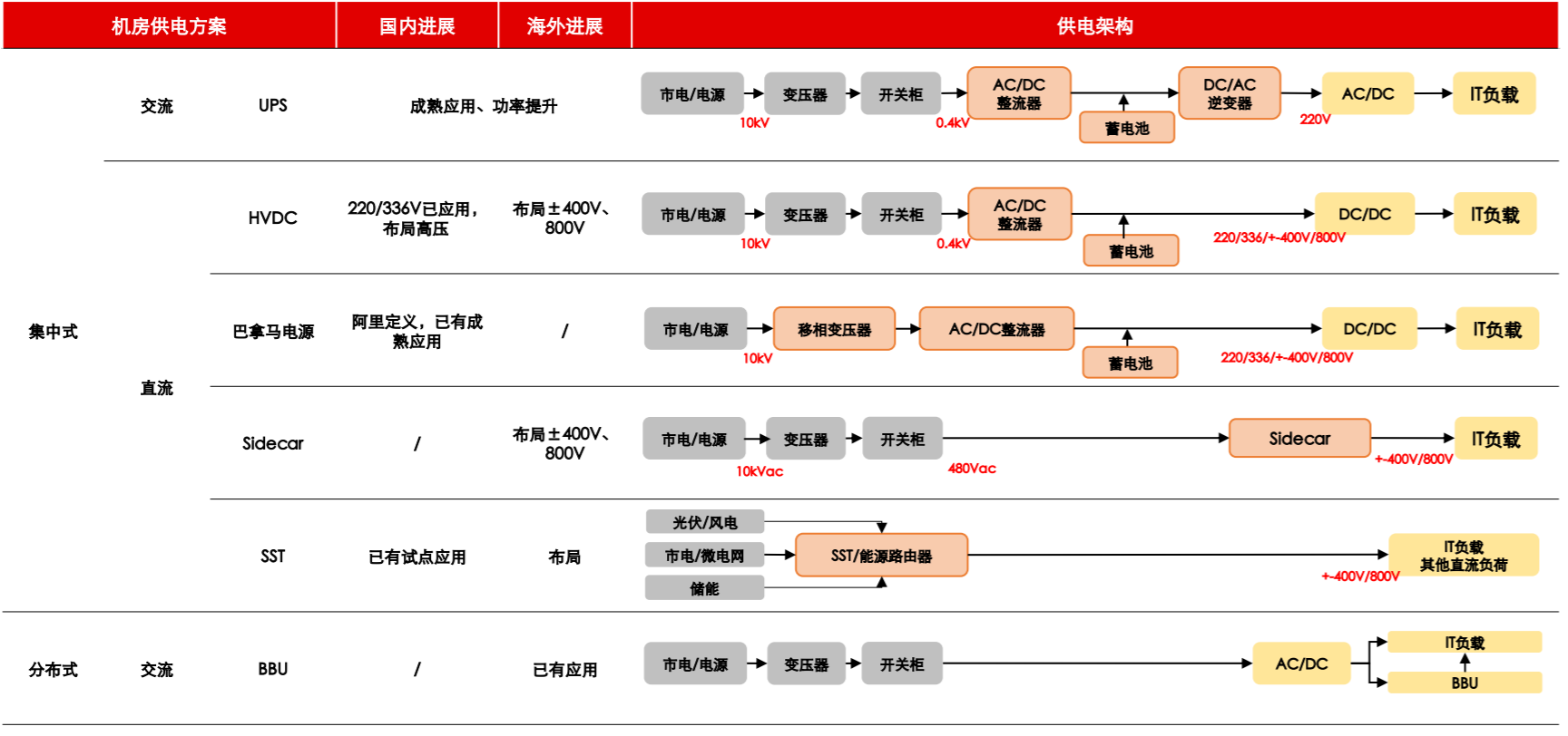从产业规划看,数据中心主流供电架构包含UPS、HVDC、SST、巴拿马电源等。整体趋势为:UPS→HVDC→巴拿马电源→SST。
