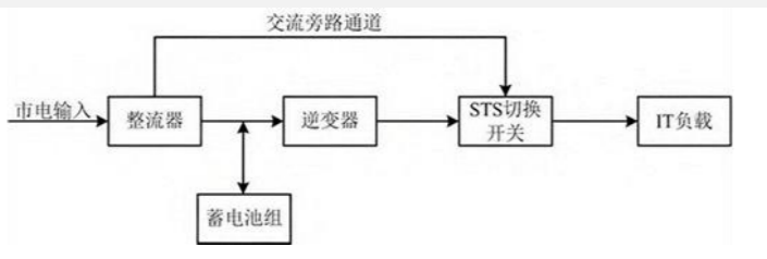 交流UPS供电架构是由整流器、逆变器、蓄电池组、静态STS切换开关组成的。当市电正常时,市电通过整流器、逆变器向负载供电,同时为蓄电池充电;当市电异常或中断时,蓄电池作为电源,通过逆变器向负载供电;当逆变器、蓄电池等中间环节故障时,通过STS切换开关,改由交流旁路向负载供电。目前数据中心和智算中心的通用供配电解决方案为 UPS 供电系统,但UPS本身在效率与能耗、空间与成本、可靠性方面存在缺陷,难以适应高功率场景。
