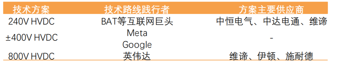 海外各大厂商采取不同方案,正在进行机架电源→边柜电源→HVDC 的三阶跃迁路径。