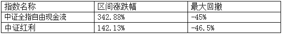 基日之日开始计算,二者最大回撤相差不大的情况下,中证全指自由现金流指数的区间收益(342.88%)也远超中证红利指数(142.13%),二者收益率相差2.4倍。