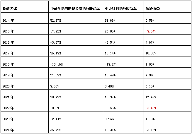 从二者指数收益特征上看,自由现金流策略展现出高成长性,红利策略则更凸显稳健收益特征。从年收益率来看,中证自由现金流指数仅在2015年、2022年两个熊市特征明显的年份中跑输中证红利,在大部分时间段都是能跑赢红利指数的。
