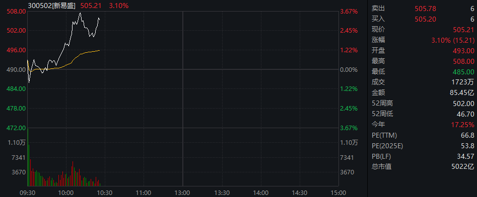 4月10日,CPO概念龙头新易盛(300502)盘中拉升,股价最高至508元/股,再创新高,总市值突破5000亿元。Wind统计数据显示,近一年来,公司股价累计涨幅约900%。