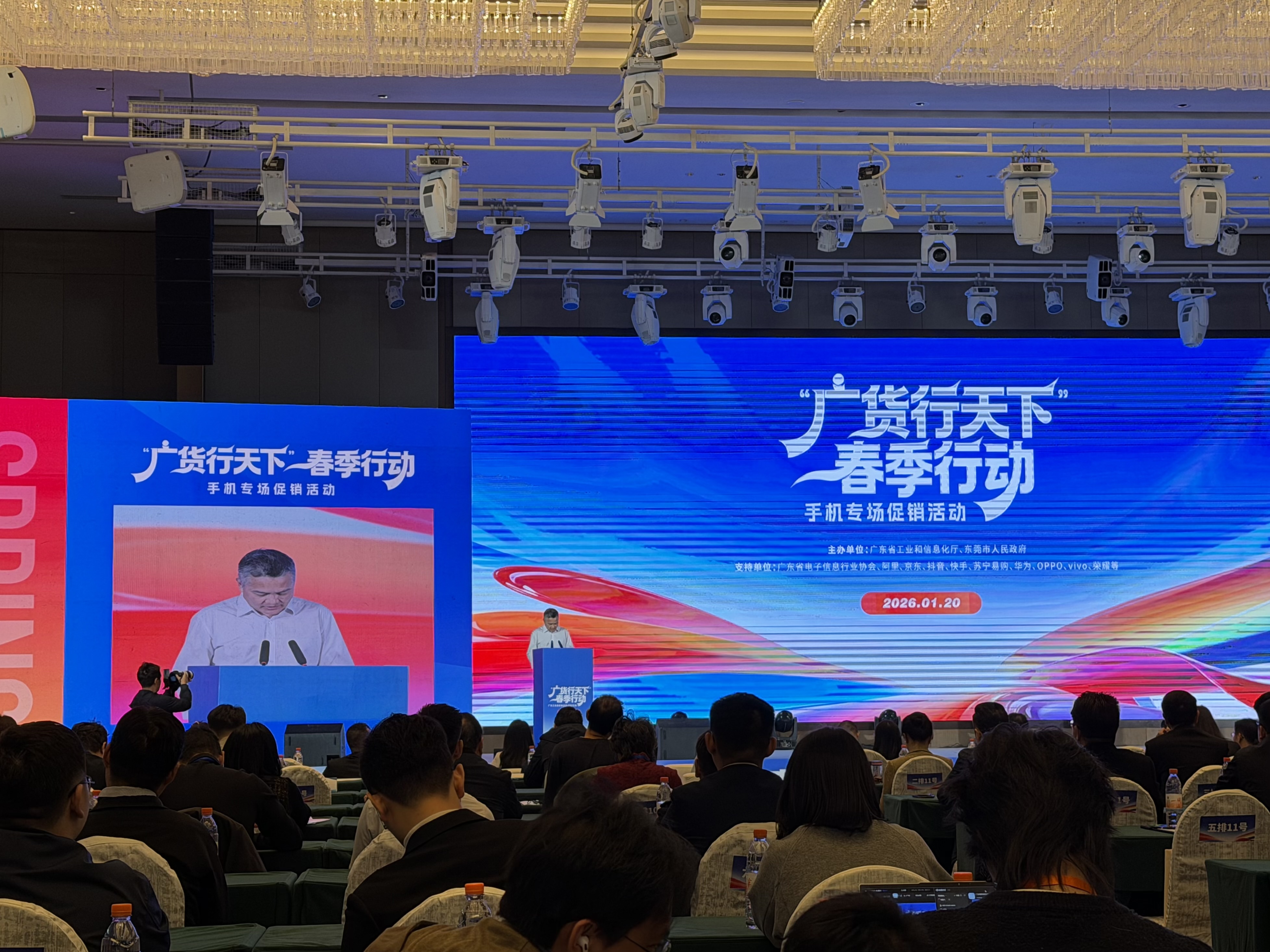 1月20日,“广货行天下”春季行动手机专场促销活动(下称“活动”)在东莞举行。在活动现场,华为、vivo、OPPO、荣耀、中兴、TCL等6家手机龙头企业展示了36款AI手机,700多家产业链企业共展示AI眼镜、智能穿戴、智能音箱等2000多种产品。