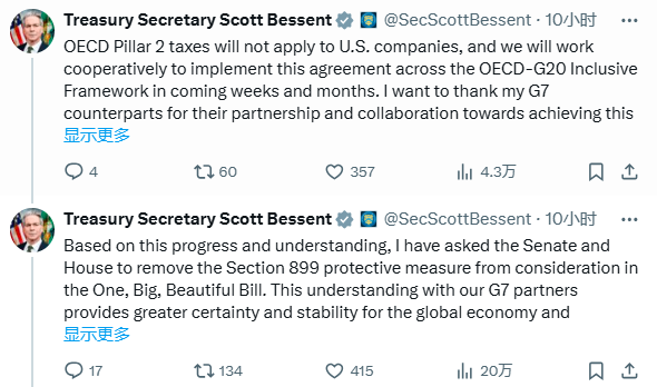 贝森特还表示,将在未来几周和几个月内,与OECD/G20包容性框架中的其他成员国密切合作,以推动这项协议的落实。“基于这一进展与共识,我已要求参议院和众议院将第899条保护性措施从《大而美法案》的审议中移除,”贝森特补充道。