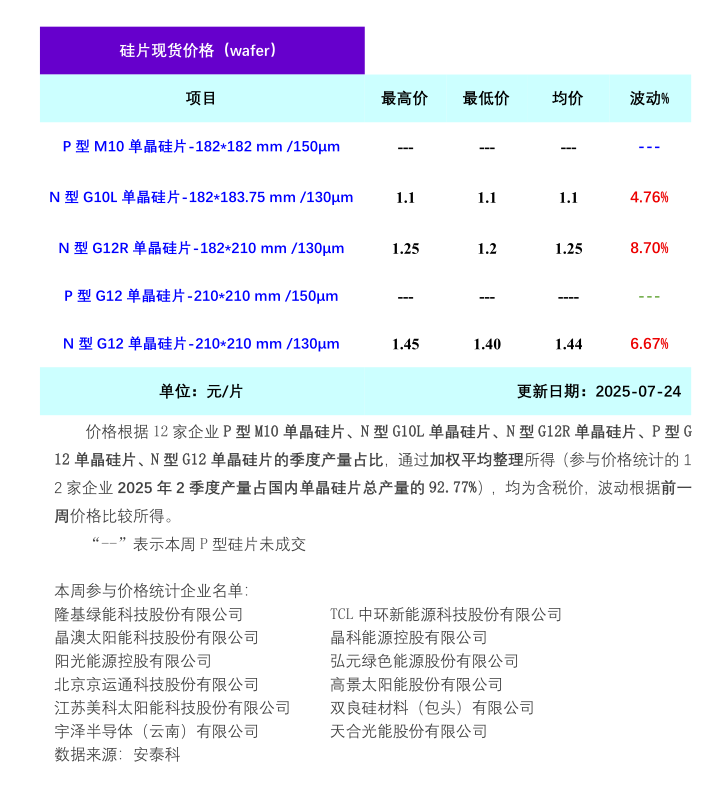 硅业分会发文称,本周硅片价格继续上行。其中,N型G10L单晶硅片(182*183.75mm/130μm)成交均价在1.1元/片,环比上周上涨4.76%;N型G12R单晶硅片(182*210mm/130μm)成交均价在1.25元/片,环比上周上涨8.70%;N型G12单晶硅片(210*210 mm/130μm)成交均价在1.44元/片,环比上周上涨6.67%。