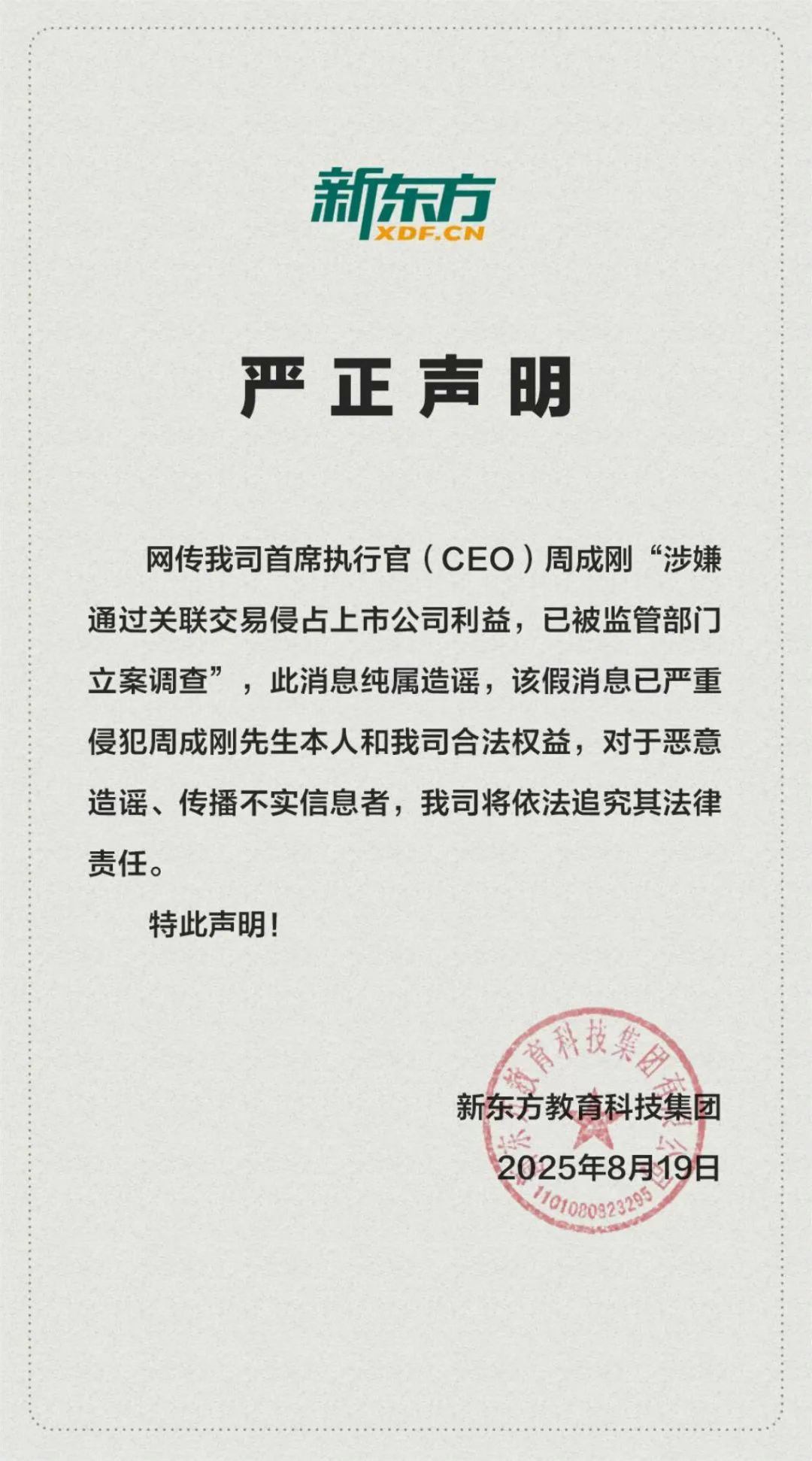 此外,新东方官方微信公众号发布严正声明称:网传该司首席执行官(CEO)周成刚“涉嫌通过关联交易侵占上市公司利益,已被监管部门立案调查”,此消息纯属造谣,该假消息已严重侵犯周成刚先生本人和该司合法权益,对于恶意造谣、传播不实信息者,该司将依法追究其法律责任。