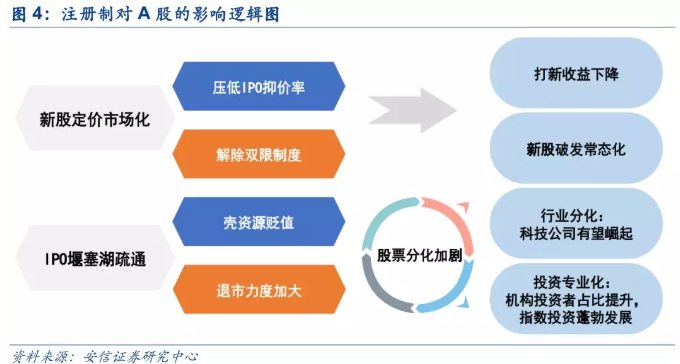 安信证券认为,一方面与注册制接轨必然带来新股定价逐步市场化,从而解除“双限制度”,压低IPO抑价率,带来打新收益下降,新股破发常态化;另一方面,注册制的实施意味着IPO堰塞湖疏通,IPO难度的降低使得借壳上市的吸引力降低,壳资源将贬值,与此同时,注册制的推进和退市力度的加大是一个硬币的两面,导致股票分化加剧,带来行业分化和投资专业化。此外,注册制将进一步加强金融对实体经济的支持,为现阶段无法盈利但是成长性良好,处于“风口”的高科技公司带来机遇。