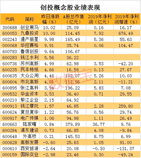 截至当前,多数创投概念股已公布了2019年业绩,九鼎投资、钱江摩托、华控赛格2019年净利润增幅超过100%。高新发展、通产丽星净利润增速超过50%。