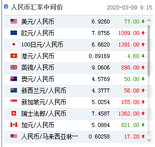 3月9日,人民币兑美元中间价调升77个基点,报6.9260,为7连升。前一交易日人民币兑美元中间价报6.9337,16:30收盘价报6.9400,23:30夜盘收报6.9342。