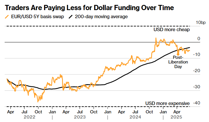 包括摩根士丹利和高盛在内的几家银行的分析师均指出,近期所谓的“交叉货币基差互换”出现了变化。这种互换是衡量将一种货币兑换成另一种货币所需额外成本的指标,该成本超出了现金市场借贷成本所反映的范畴。当对某种特定货币的需求增加时,这种额外成本或溢价就会上升;而当需求不那么旺盛时,这种溢价则会下降,甚至可能出现负值。