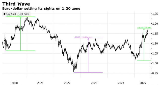 周四,欧元兑美元汇率突破 1.17,达到自 2021 年 9 月以来的最高水平。这是因为伊朗与以色列达成停火协议,以及市场预期美联储将降息,这些因素都对美元造成了压力。德国具有历史意义的财政支出计划也增强了投资者的信心,认为欧洲终于摆脱了多年的停滞状态,从而进一步坚定了持有欧元的意愿。