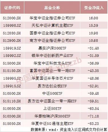科技类ETF中,华夏中证5G通信主题ETF大幅净流出83.23亿元,华夏国证半导体芯片ETF、华宝中证科技龙头ETF分别净流出48.06亿元、36.09亿元,不过,天弘中证计算机主题ETF净流入15.39亿元。此外,三大券商类ETF华宝中证全指证券公司ETF、国泰中证全指证券公司ETF、南方中证全指证券公司ETF净流入均超10亿元。