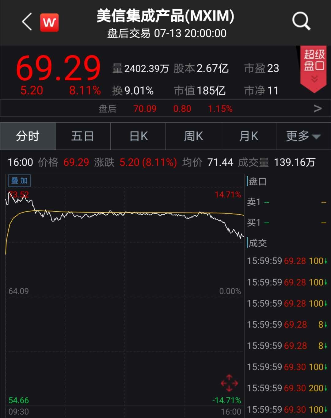 Maxim股价一度上涨超14%,随着美国科技股尾盘跳水,涨幅缩窄至8.11%,报收69.29美元,市值185亿美元。
