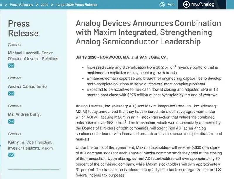 据了解,ADI 和Maxim的交易预计将在2021年夏季完成。不过,完成的前提是要满足惯例成交条件,包括收到监管批准、两家公司股东批准等。
