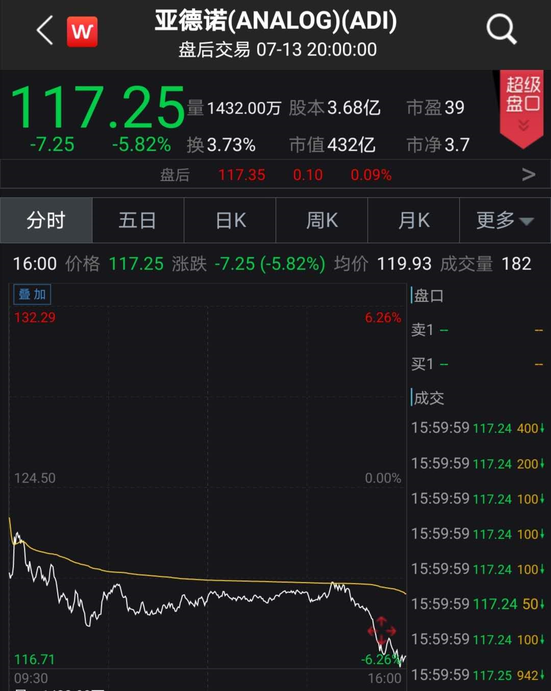 交易公告发布后,ADI低开后,震荡下行。尾盘跟随美股跳水,股价下跌5.82%至117.25美元,市值432亿美元。