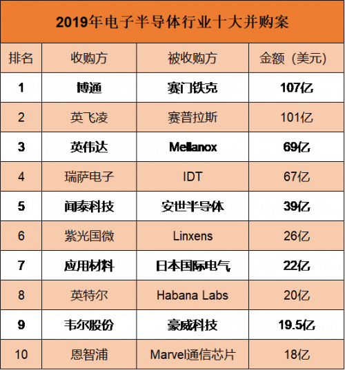 2019年,博通107亿美元收购赛门铁克企业安全业务,成为去年最大的并购案;中国公司中,闻泰科技39亿美元收购安世半导体;紫光国微以26亿美元收购了Linxens;韦尔股份以19.5亿美元收购了豪威科技。