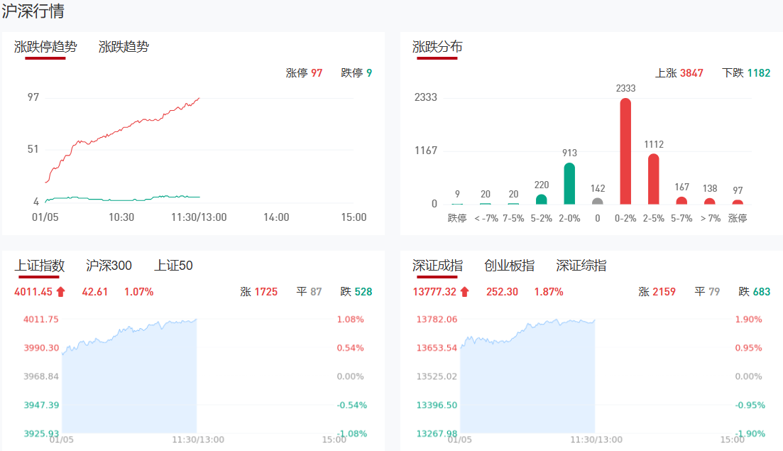 市场早盘高开高走。时隔34个交易日,上证指数盘中重回4000点,创业板指涨超2%。沪深两市半日成交额1.64万亿,较上个交易日放量3238亿。盘面上热点快速轮动,全市场超4000只个股上涨,其中98只个股涨停。从板块来看,脑机接口概念爆发,二十余只成分股涨停,三博脑科、美好医疗、创新医疗、倍益康、塞力医疗涨停。商业航天概念反复活跃,中国卫通5天3板。保险板块走强,新华保险、中国太保双双续创历史新高。半导体产业链表现活跃,亚翔集成、圣晖集成涨停。下跌方面,海南自贸概念集体大跌,海南发展跌停。