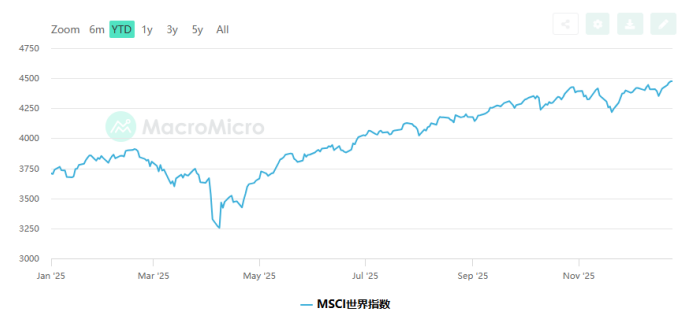 这一年,市场在特朗普关税政策的冲击下加剧震荡,甚至一度推动包括美国在内的多国股市跌入技术性熊市。尽管如此,全球市场最终展现出惊人韧性。在各自增长叙事驱动下,多国股指屡创新高,并推动MSCI全球指数在2025年再度实现两位数涨幅。截至发稿,该指数年内已累计上涨逾20%,连续第三年涨幅突破15%。