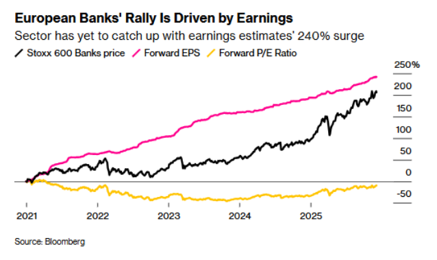 自2021年初以来,银行股回报完全由盈利增长驱动。数据显示,斯托克600银行指数的未来盈利预期飙升242%,甚至超过同期股价206%的涨幅。这也意味着该板块估值较当时降低了近10%。