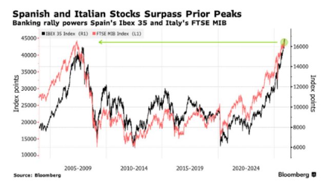 相比之下,西班牙和意大利股市就为德国提供了很好的借鉴。凭借银行股的强劲涨势,西班牙基准股指IBEX 35在10月成功突破并刷新了自2007年金融危机以来的历史收盘高点,更以全年约47%的累计涨幅成为全球表现最亮眼的指数之一。意大利富时MIB指数同样在11月触及2001年以来的最高水平,全年大涨逾30%。