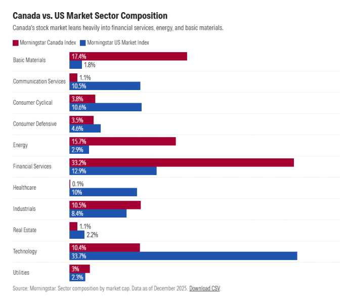 晨星公司在一份报告中指出,构成加拿大股市主引擎的三大板块——金融(占指数32%)、材料(17%)和能源(15%)——均在2025年获得顺风助力。