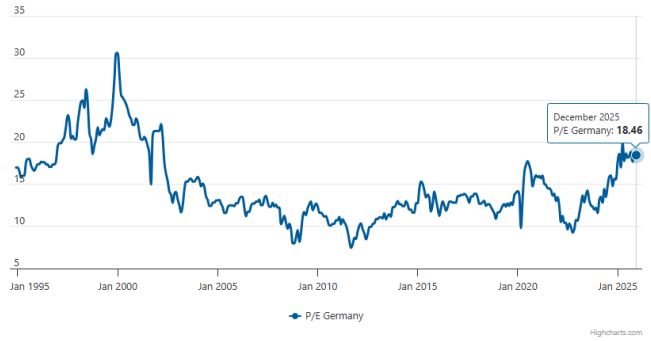 根据worldperatio.com的数据,截至12月,德国股市的远期市盈率达到约18.46倍,显著高于过去5年12.04-16.04的平均市盈率区间。