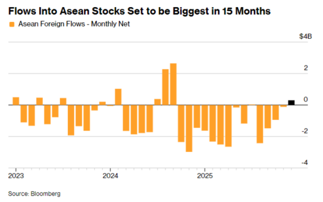 摩根大通分析师上月曾指出,“温和的估值水平正让东盟市场对价值型投资者的吸引力逐步提升,尤其是在盈利增长出现反弹的情况下”。从12月的资金流向数据来看,这一判断已得到验证。