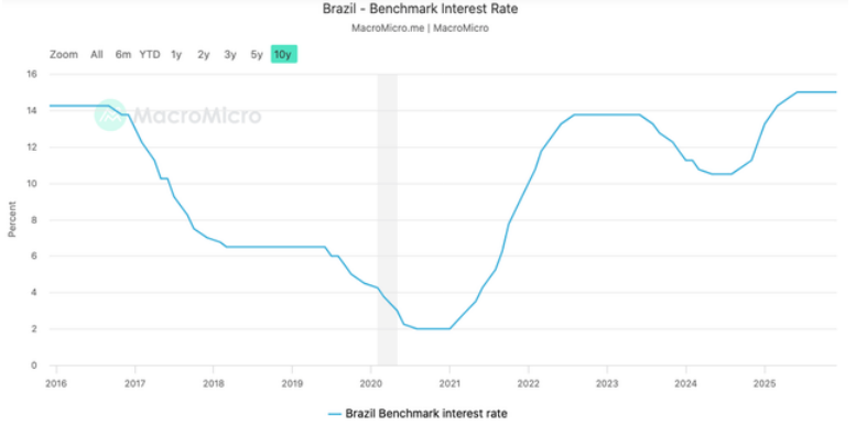 与许多已经启动降息周期的国家不同,巴西央行在2024年9月重新进入加息周期,并自今年6月以来将基准利率Selic维持在15%的高位。这为巴西构筑出较强的“利差优势”。巨大的利差吸引了国际资本流入当地市场,成为支撑股市上涨和汇率走强的重要支点。