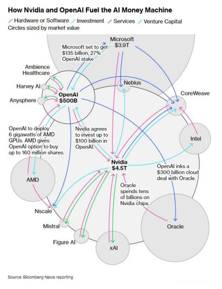事实上,“AI泡沫”论并非空穴来风。与往年单纯讨论技术前景不同,市场今年的焦点已转向“循环融资” (Circular Financing) 这一金融层面的潜在风险——尤其是甲骨文(ORCL.US)、OpenAI与英伟达之间的巨额交易(英伟达等巨头可能通过投资OpenAI,OpenAI利用现金向甲骨文支付巨额预付款租用算力,而甲骨文再用这笔资金购买英伟达的芯片)。