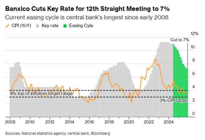 墨西哥则顺应了全球降息趋势,在12月连续第十二次下调利率,至7%,这为股市等风险偏好较高的资产带来提振。与此同时,墨西哥7%的利率依然高于美国等国家,这也为套利交易创造了条件。