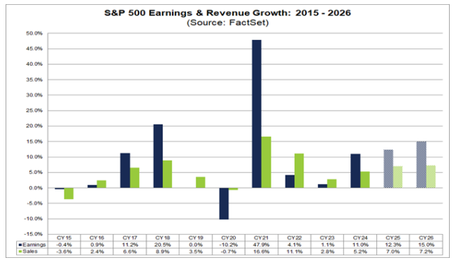 在2026年,企业盈利有望创下历史新高。FactSet数据显示,标普500指数将在明年连续第三年实现两位数盈利增长。2026年的预期盈利增长率(同比)为15.0%,高于过去十年(2015-2024年)8.6%的年均盈利增速。若全年实现15.0%的增速,这将是标普500指数盈利连续第六年增长,也是连续第三年实现两位数增长。